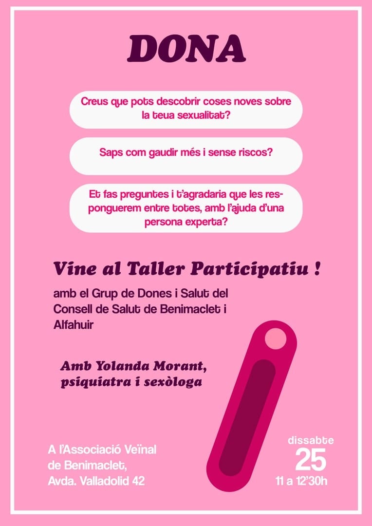 Al plafó que hi ha a l’entrada, juntament amb diferents cartells d’activitats i convocatòries, tan pròpies com de diferents entitats del barri, hi havia penjat un cartell editat pel Grup de Dones i Salut del Consell de Salut d’Alfahuir i Benimaclet anunciant un taller sobre sexualitat impartit per la psiquiatra i sexòloga Yolanda Morant a la seu de l’Associació Veïnal de Benimaclet. El cartell del taller –dirigit a persones adultes- animava les participants a preguntar sobre qualsevol dubte que tingueren sobre el tema, siga com «gaudir més», «descobrir noves coses» o «evitar riscos».