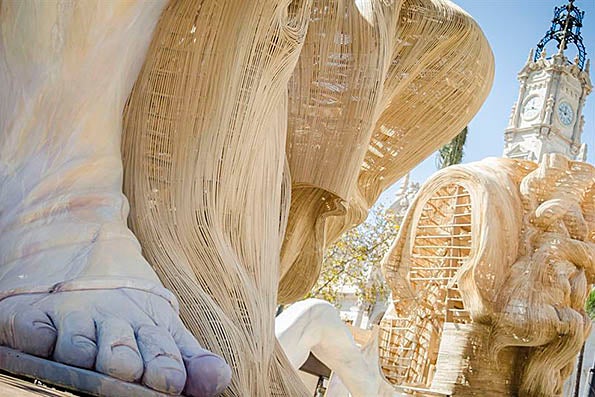 Amb tot, la figura central de la falla municipal ha precisat d’uns 3 milions de grapes i uns 55 metres cúbics de fusta d’om i de pollancre. “Solc posar l’exemple que, si les posàrem una darrere d’una altra, recorreríem una distància de 240 quilòmetres”, ha il·lustrat l’artista.