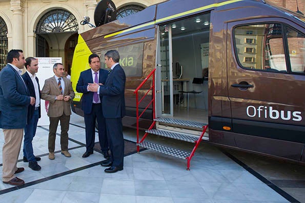 El president de la Diputació de Castelló, Javier Moliner, i el director territorial de Bankia, Miguel Capdevila, han presentat el nou servei de ‘ofibús’ que prestarà servei a 25 pobles xicotets que s’havien vist afectats per la reestructuració de les caixes d’estalvis.