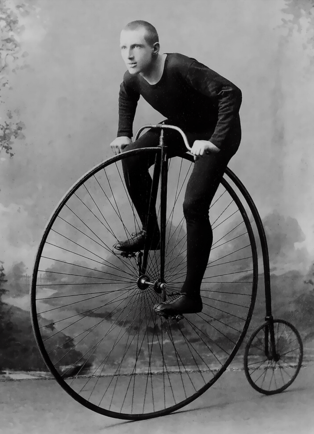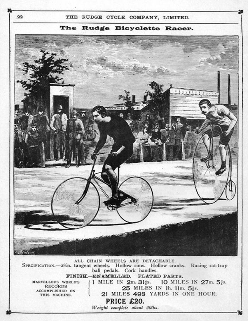 En este context d’expansió del velocipedisme, la bicicleta va evolucionar per aconseguir una major velocitat de desplaçament. Com que els pedals estaven ancorats a la roda de davant, la solució va consistir a ampliar-ne el diàmetre. Així van aparèixer les espectaculars bicicletes de roda alta davantera (que arribaven fins als 1,5 metres de diàmetre) i que es van popularitzar a Anglaterra amb el nom de Penny-Farthing, a les dècades de 1870 i 1880. El seu nom prové de les monedes del penic (penny) i del quart de penic (farthing) del Regne Unit, sent la primera més gran que l’altra, com les rodes d’esta bicicleta. El mecanisme de pedals fixats a una roda tan gran proporcionava una major velocitat, mentre que la situació sobre-elevada del seient feia que el centre de gravetat del ciclista pujara, condicionant una major exigència del control de l’equilibri i de l’habilitat de conducció, però aportant també una major sensació de flotació en l’aire i de vertigen. Podríem dir que oferia una conducció més “esportiva”.