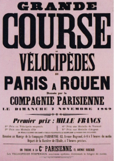 Però, possiblement, el que més va influir va ser una sèrie d’esdeveniments organitzats a París que són considerats les primeres proves ciclistes. El diumenge 12 de desembre de 1867 es va celebrar un ral·li de 17 km entre París i Versalles, una de les primeres sortides col·lectives conegudes. Posteriorment, el 31 de maig de 1868, al parc de Saint-Cloud, es van disputar diverses curses de curta distància, incloent una prova d’habilitat i equilibri, on guanyava qui tardava més temps en completar el recorregut sense posar el peu a terra. Però el gran esdeveniment fundacional del ciclisme com a esport va ser la cursa del 7 de novembre de 1869, entre París i Rouen, amb un recorregut de 123 km. Hi van participar més de cent aventurers —i alguna aventurera—. Entre els 34 que van aconseguir acabar la prova, destaca Elisabeth Sarti, coneguda com “Miss America”, que va creuar la línia d’arribada en 29a posició. El vencedor, l’anglès James Moore, va tardar 10 hores i 40 minuts en completar el recorregut.