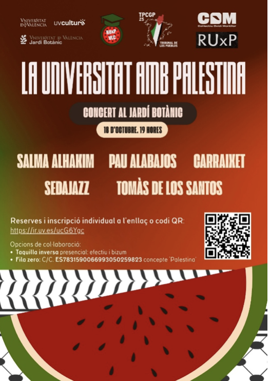 Les persones que formem el node VLC de la Xarxa Universitària per Palestina (RUxP) vam decidir organitzar un acte especial per presentar a València el Tribunal dels Pobles sobre la Complicitat amb el Genocidi Palestí a l’Estat Espanyol (TPCGP-25). Amb aquest acte, un concert solidari, la nostra intenció també ha estat explicar una cosa que creiem evident: és compatible i desitjable gaudir d’una vesprada de música, consciència política i vincles en comunitat. Organitzar una activitat que barreja universitat, pensament, música, compromís polític, justícia social i reunió popular, ni és estrany, ni de bon tros és nou.