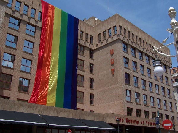 La UGT-PV ha col·locat en la Casa del Poble d’UGT a València una gegantesca bandera LGTB per a reivindicar la diversitat afectiva-sexual i la no discriminació amb motiu del Dia Internacional de l’Orgull LGTB que se celebra cada any al voltant de la data del 28 de juny.