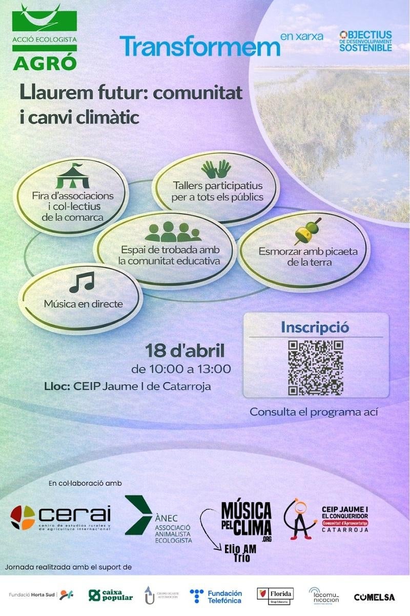 Acció Ecologista-Agró, CERAI i ÀNEC han organitzat per al pròxim 18 d’abril una jornada comunitària al CEIP Jaume I de Catarroja amb l’objectiu de generar un espai de trobada i aprenentatge compartit al voltant del territori, la resiliència i l’acció col·lectiva després de la dana.