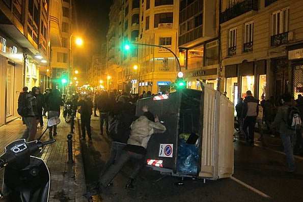 El recorregut ha continuat per Comte de Trenor, on han bolcat un altre contenidor, amb la Policia Local tallant el trànsit d’aquesta concorreguda avinguda, cap a la plaça de Tetuán i Blasco Ibáñez, on un grup d’uns 50 joves ha continuat la seua marxa davant una discreta presència policial.