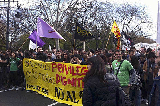 La Coordinadora Estudiantil de València ha convocat sota el lema ‘Els seus privilegis o la nostra dignitat’. La protesta que es durà a terme simultàniament en molts altres punts de l’estat espanyol, coincideix també amb la segona jornada de vaga estatal convocada pel Sindicat d’Estudiants (ES) que ha cridat també a la mobilització a la mateixa hora i al mateix lloc amb la consigna ‘Fora el Decret 3+2. El fill de l’obrer a la universitat’.