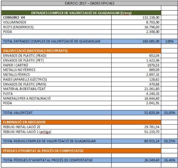 Malgrat això, agafant les dades oficials de 2017 publicades en la premsa1 en resposta del president del Consorci a les nostres crítiques, podem veure que hi hagueren 80.915 tones rebutjades que anaren a abocador i 52.820 tones que es valoritzaren, és a dir, que sols es recuperaren el 33% dels RSU2, mentre es tiraven més de la meitat. L’objectiu europeu era arribar enguany al 50%, cosa que ni de lluny complim a Espanya i que ens costarà penalitzacions i milions. Per comparar, a Àustria reciclen ja el 65%…
