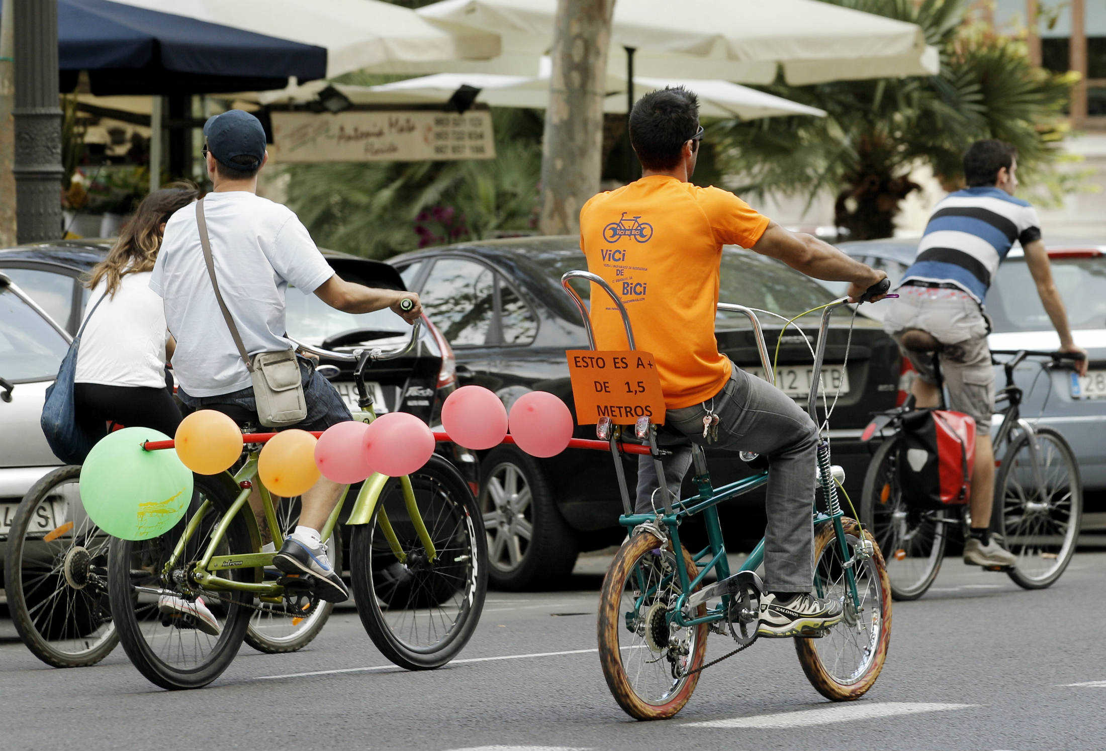 Un grup de ciclistes han adossat a la part posterior de les seues bicicletes uns tubs d’1,5 metres de llarg, on al seu extrem han col·locat globus i un cartell amb la frase “bicicleta a 1,5 metres”.