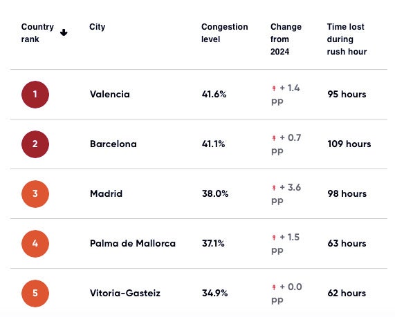 Entre els indicadors que té en compte l’estudi, hi ha el temps perdut en embossaments, que a València és de 95 hores anuals, encara per darrere de Barcelona (109 hores) i Madrid (98). També la distància recorreguda en 15 minuts (5,2 quilòmetres; 0,2 menys que el 2024), la mitjana de temps en recórrer 10 quilòmetres (28 minuts 42 segons; 48 segons més que l’any passat), i la distància mitjana en hora punta (18,5 km/h; un quilòmetre més lent que el 2024).