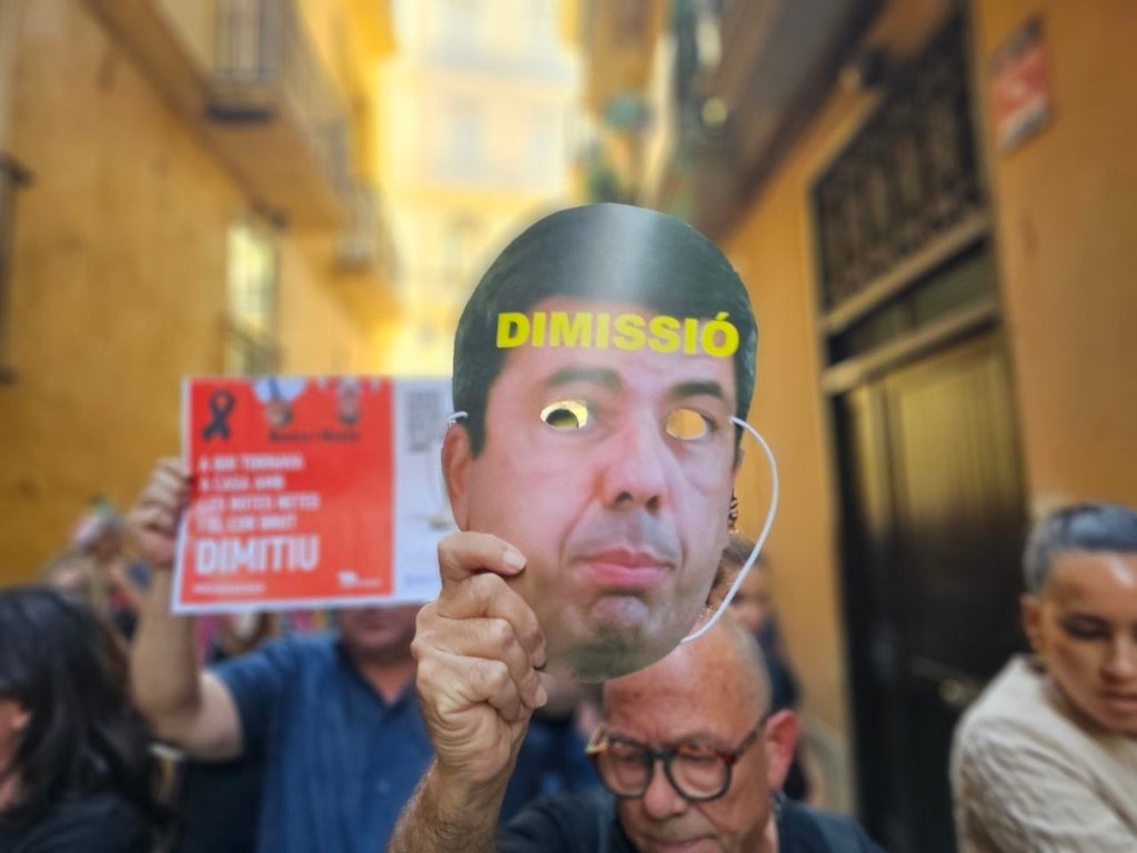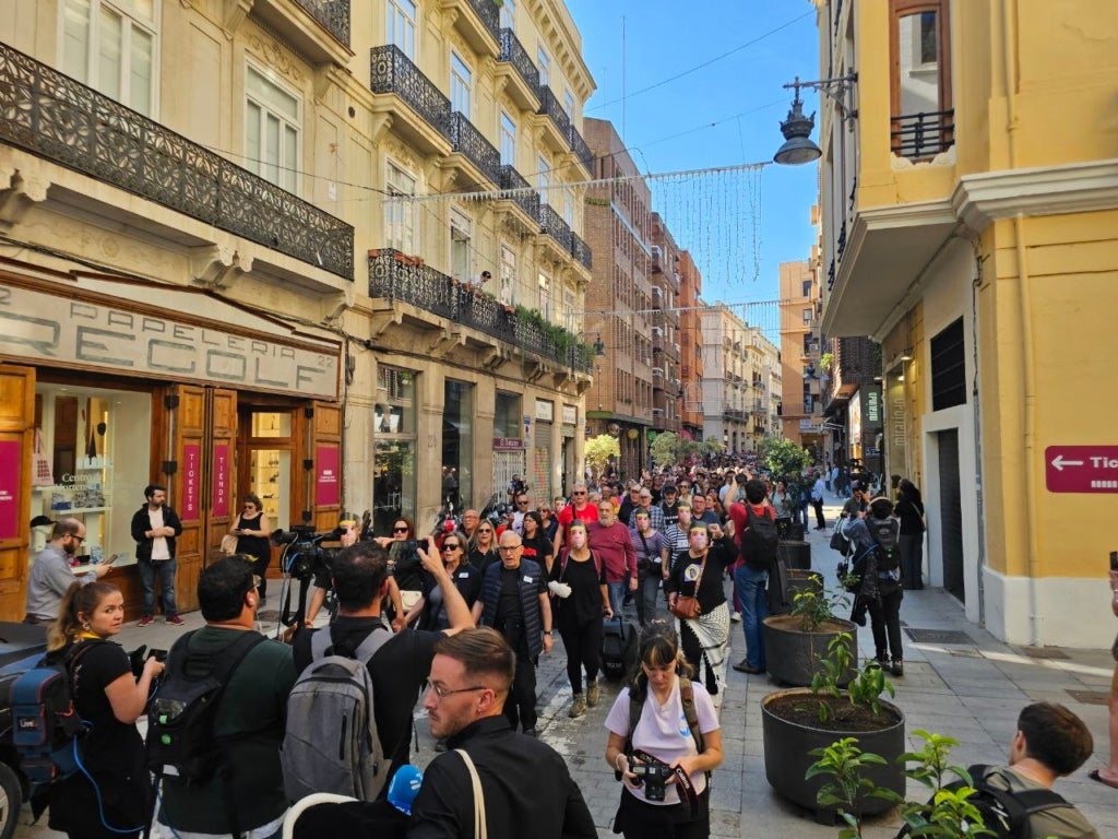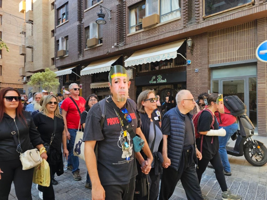 Després de l’homenatge, els participants han recorregut el mateix itinerari que va fer el president Mazón en direcció al restaurant El Ventorro, on va dinar amb la periodista Maribel Vilaplana. “La intenció era anar al Palau, però no se’ns ha permès”, ha remarcat Cardona. Alguns dels participants s’han posat màscares amb la cara del cap del Consell i vestits de presisdaris per a dur a terme el recorregut.