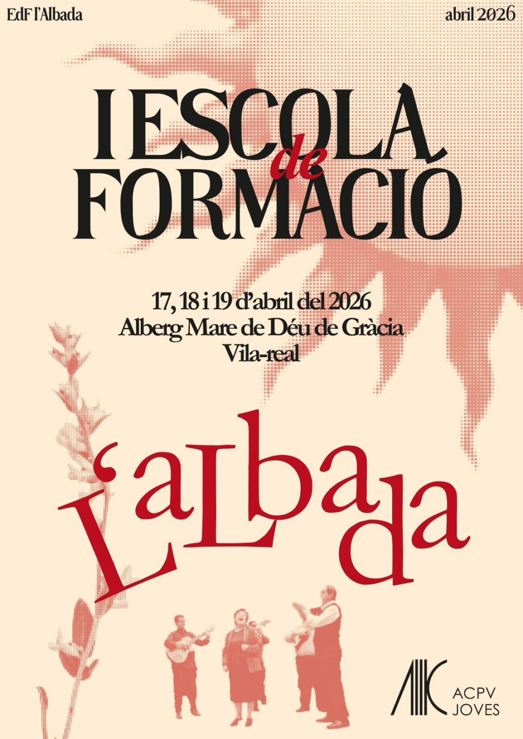 ACPV Joves celebrarà del 17 al 19 d’abril l’Escola de Formació “L’albada” a Vila-real (la Plana Baixa), una trobada que combinarà reflexió política, debat cultural, tallers pràctics i espais de convivència albergats a l’Alberg Mare de Déu de Gràcia. La iniciativa es presenta com una proposta adreçada al jovent amb voluntat de formació i activació col·lectiva, amb un programa que aborda qüestions com la identitat valenciana, l’infrafinançament, la resistència del poble kurd o la participació cultural de proximitat.