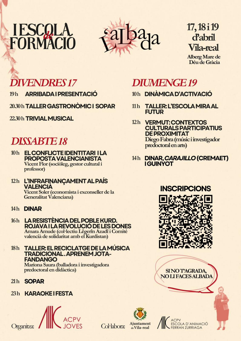 El cartell de la trobada situa l’activitat entre els dies 17, 18 i 19 d’abril de 2026 i identifica ACPV Joves com a entitat organitzadora. També hi col·laboren l’Ajuntament de Vila-real i l’Escola d’Animació Ferran Zurriaga d’ACPV. Les inscripcions es canalitzen a través d’un codi QR inclòs en el programa.