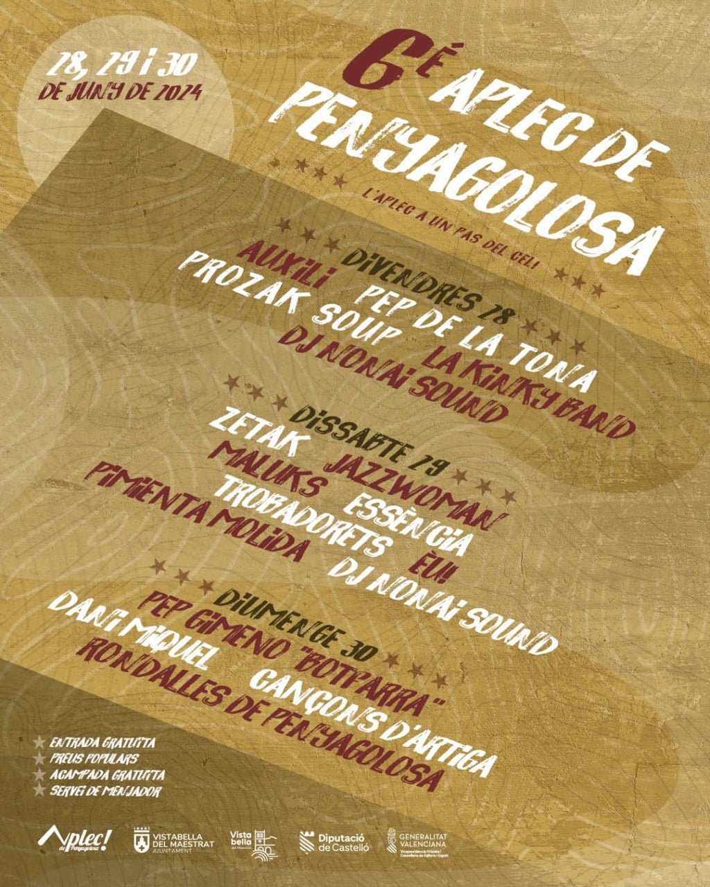 «A un pas del cel» és el lema del VI Aplec de Penyagolosa que se celebrarà el cap de setmana vinent, 28, 29 i 30 de juny, a Vistabella del Maestrat i que comptarà, entre altres, amb Auxili, JazzWoman, Maluks, Pep Gimeno Botifarra o els bascs Zetak. A més de la música en directe, xarrades, sopars, rutes, contacontes, exposicions, cercaviles i correfocs seran algunes de les activitats que ompliran el poble durant aquests dies. L’Aplec implica els municipis de Vistabella del Maestrat, Xodos, Atzeneta del Maestrat i Benafigos.