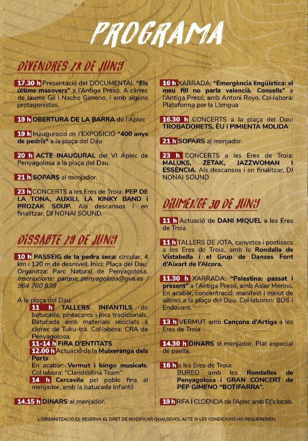 Dissabte començarà amb un passeig per la pedra seca, seguit de la fira d’entitats, l’actuació de la Muixeranga del Ports, tallers, cercavila, la xerrada «Emergència lingüística: el meu fill no parla valencià. Consells», a càrrec de Toni Royo, i concerts de Trobadorets, Èu! i Pimienta Molida. A la nit, serà el torn de Zetak, JazzWoman i Maluks.