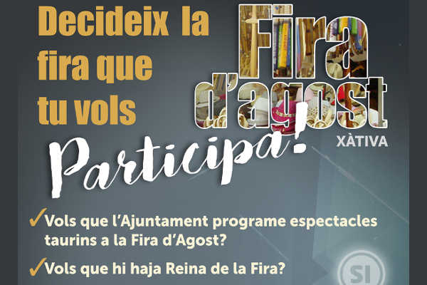 L’Ajuntament de Xàtiva ha convocat una enquesta ciutadana sobre la Fira d’Agost en què es formularan les preguntes “Vols que l’Ajuntament programe espectacles taurins a la Fira d’Agost?” i “Vols que hi haja Reina de la Fira?”. Amb això el consistori pretén impulsar la participació dels veïns de Xàtiva en la presa de decisions del govern municipal.