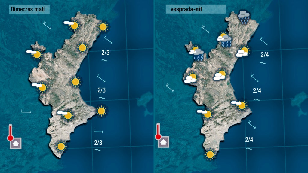 Després d’uns dies de calma meteorològica, un xicotet canvi d’oratge farà acte de presència entre dimecres i dijous. Encara que la situació es manté majoritàriament estable, el vent de ponent farà que les temperatures augmenten durant el dia de demà. Dimecres serà el dia més calorós de la setmana, especialment a les comarques d’interior, on les màximes es dispararan per damunt dels 30 graus. A partir de la nit, s’espera que alguns núvols i pluges puntuals facen acte de presència al nord del País Valencià, eixint pel sud durant la matinada de dijous.