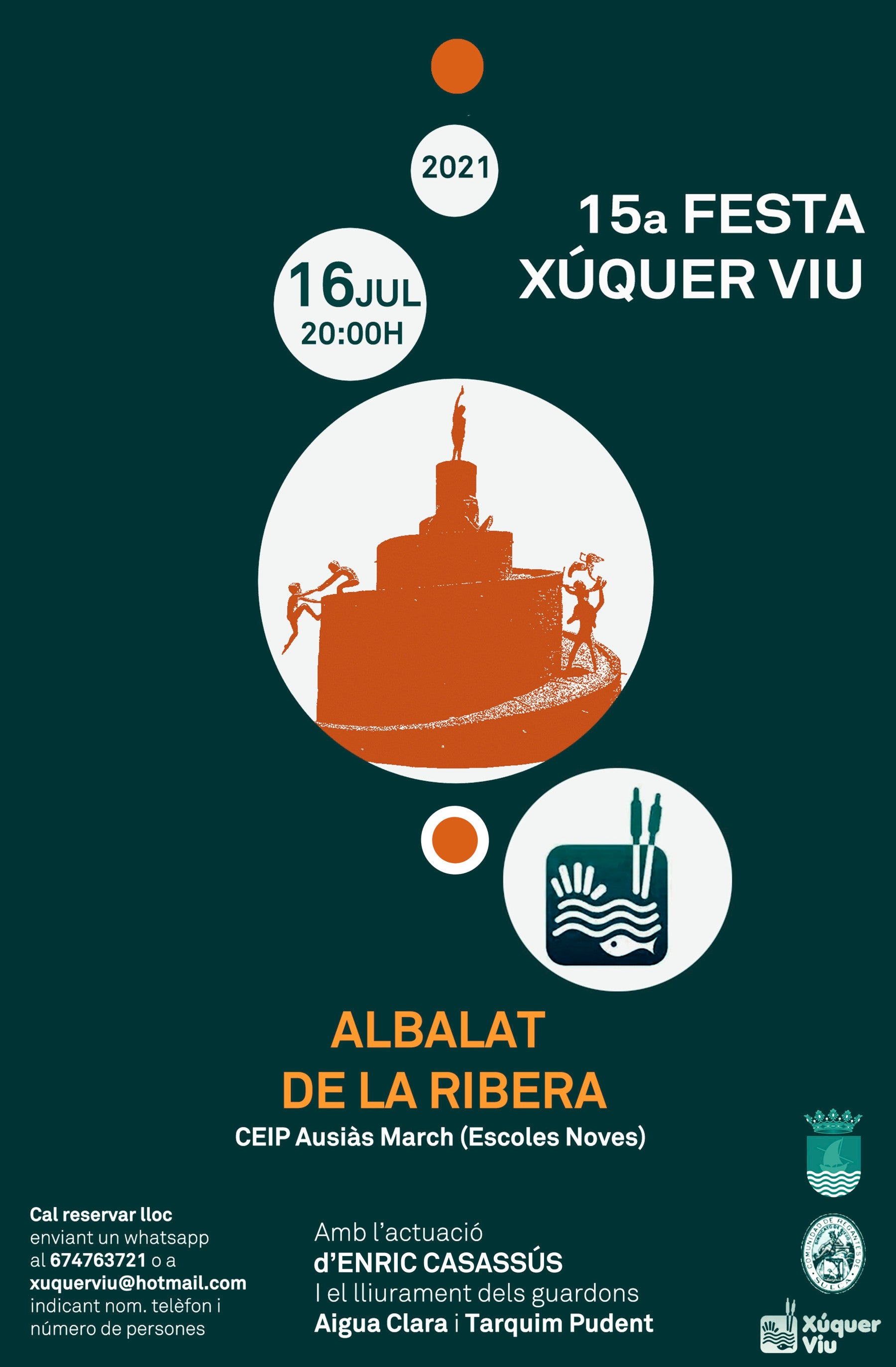 Enguany, la 15a Festa de Xúquer Viu serà el divendres 16 de juliol a les 20.00 al Col·legi Ausiàs March d’Albalat de la Ribera (Escoles Noves). Enguany sense sopar per la situació de pandèmia.