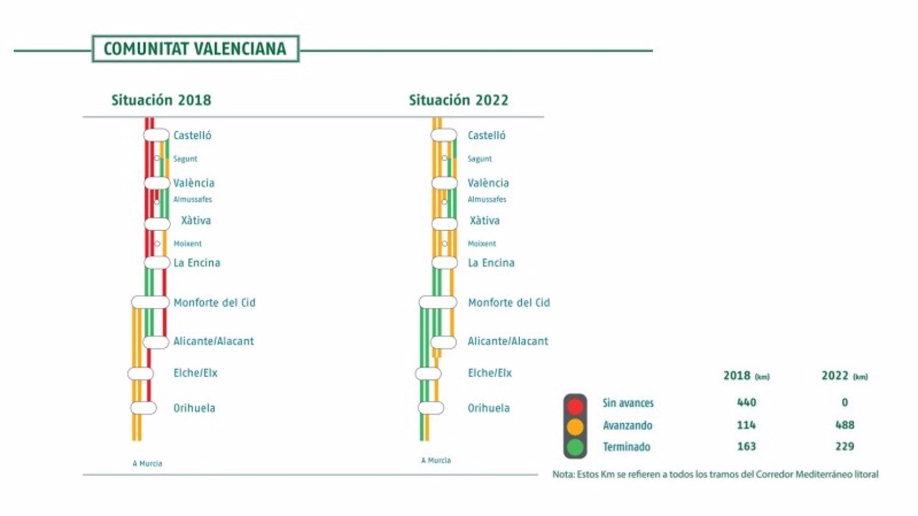 A partir d’uns semàfors, Boira ha traslladat als periodistes la instal·lació del Corredor al seu pas pel País Valencià, on ara mateix hi ha 488 quilòmetres en marxa i 229 ja acabats. El comissionat ha comparat aquesta situació amb la que hi havia al 2018, quan va accedir al càrrec, i quan hi havia 440 quilòmetres sense cap avanç, 118 en procés i 163 acabats. Boira ha destacat que, actualment, tots els trams del corredor tenen com a mínim una planificació, encara que siga en forma d’estudis previs.