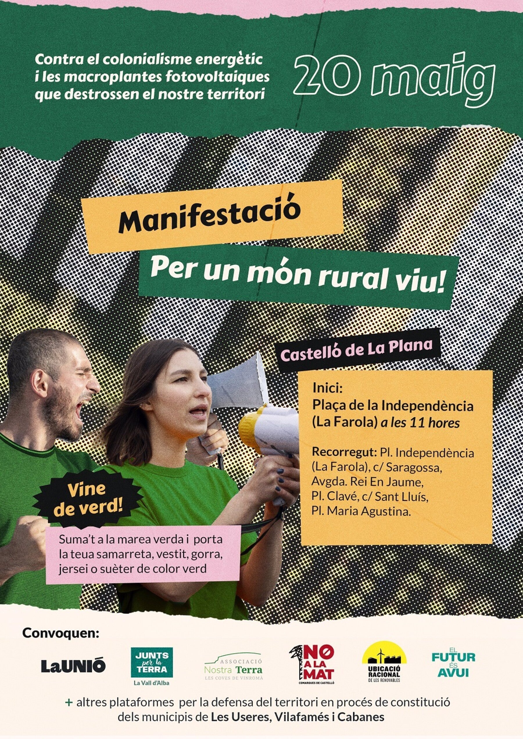 La Unió Llauradora i Ramadera i les associacions Junts per la Terra de la Vall d’Alba, l’Associació Nostra Terra, no a la MAT, Per una ubicació racional de les renovables, El futur és avui i associacions de les Useres, Vilafamés i Cabanes convoquen una manifestació el pròxim dissabte, 20 de maig, a Castelló de la Plana per a mostrar el seu rebuig als projectes de plantes fotovoltaiques previstos en algunes comarques del nord i per a reclamar un món rural viu.