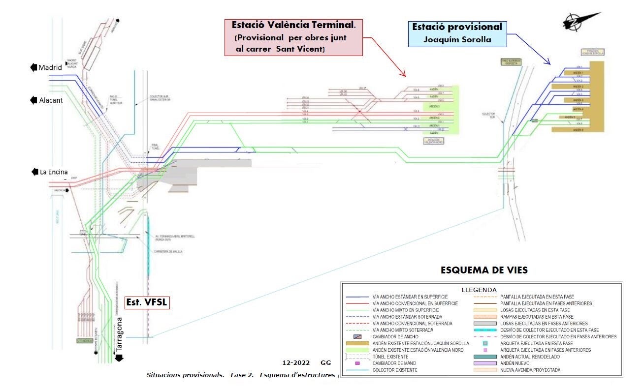 Això només és possible, repetisc, llevant els trens del solar de les obres, habilitant una nova estació provisional al solar de Macosa per obres per a tot l’ample Renfe i una part del mixt, tal com es reflecteix en l’esquema adjunt. D’aquesta manera, s’alliberaria tot el solar afectat, es deixaria l’ample internacional i la via de l’Euromed, tal com està previst en el projecte del canal d’accés, que està a punt d’iniciar-se, i es complementaria el recorregut de viatges fins a l’Estació del Nord a les futures d’Aragó i Universitats per als estudiants, amb bussos llançadora pel carrer de Sant Vicent adaptat –ampliant la calçada, tal com ja està previst–, tal com passa ara amb els trens AVE que arriben a l’estació de Joaquim Sorolla.