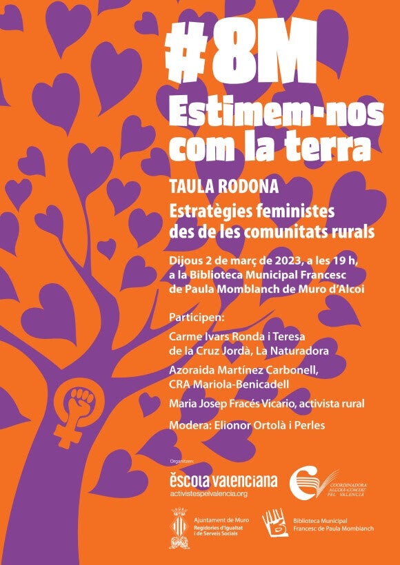 Escola Valenciana i l’Ajuntament de Muro han organitzat, el proper dijous 2 de març a les 19 hores, una taula redona sobre «estratègies feministes des de les comunitats rurals». L’acte, titulat «8M, estimem-nos com la terra», tindrà lloc a la Biblioteca Municipal Francesc de Paula Momblanch d’aquest municipi del Comtat.