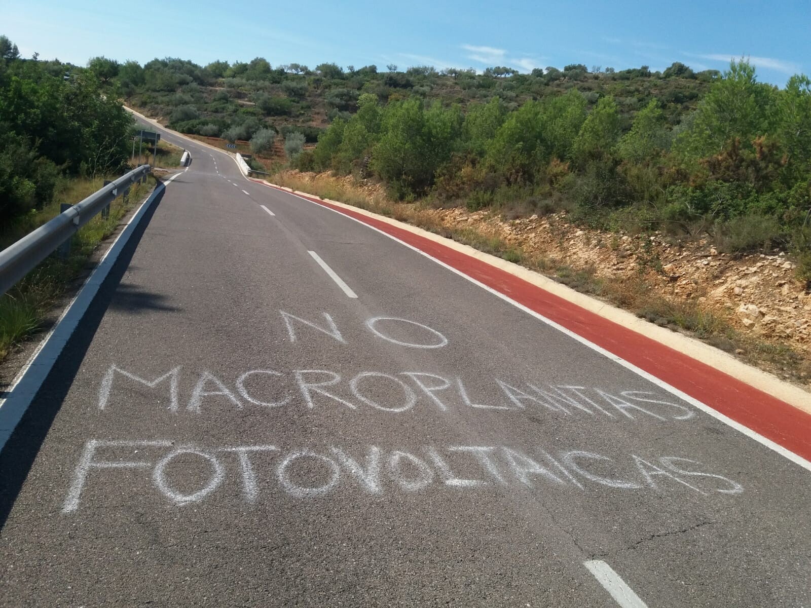 Els concentrats han desplegat pancartes i banderoles al pas dels ciclistes i han realitzat pintades a l’asfalt per tal de reivindicar una transició energètica racional i compatible amb el territori, on no siguen els municipis rurals els que paguen tota la factura.