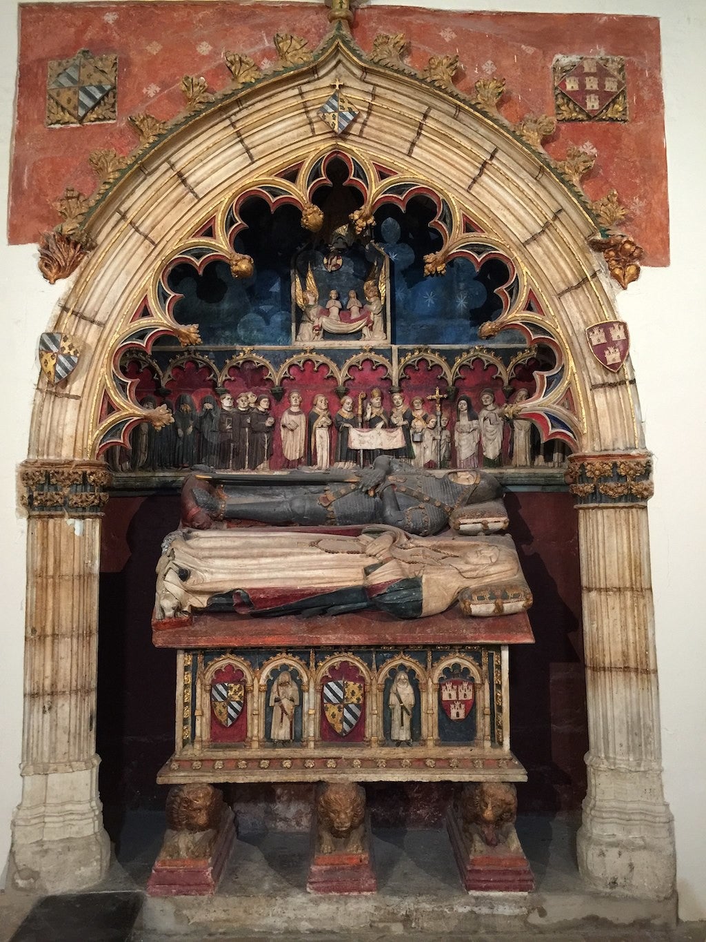 Dins de totes aquestes formes arquitectòniques gòtiques descansa el sarcòfag, elevat gràcies a tres lleons amb diferents actituds. Es pensa que aquests estan carregats d’un fort simbolisme. Es parla d’ells com a símbol de la doble naturalesa de Crist, divina i humana, i de la seua victòria sobre la mort: la resurrecció. També es poden veure com a símbol de vigilància. L’urna queda adossada al mur, decorada en frontal i laterals, la forma més habitual de sepultura a la València gòtica.