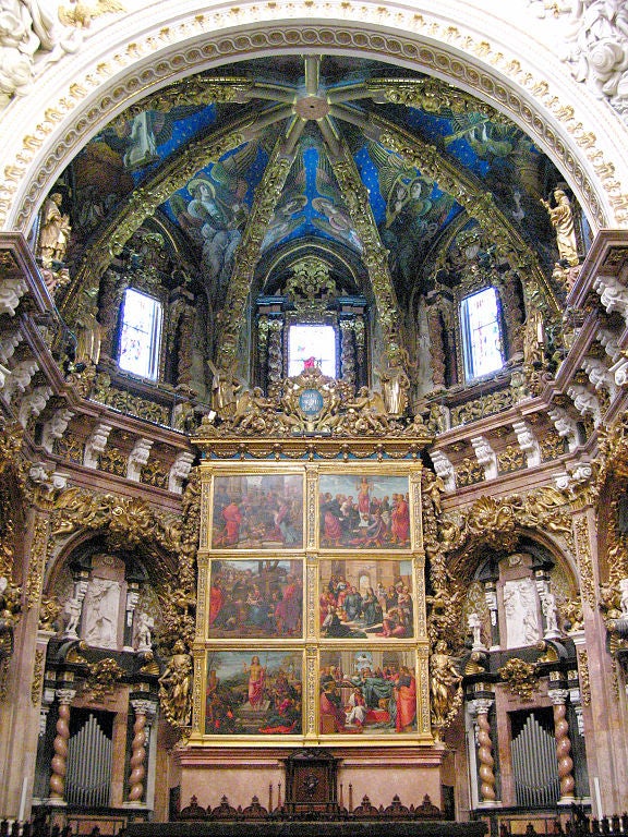 Aquestes pintures van ser tapades per una luxosa ornamentació barroca durant 1674-1682, duta a terme sota la direcció de Juan Pérez Castiel. L’absis gòtic de planta poligonal va quedar recobert amb noves voltes, superposició d’adorns, imatges, pilastres, columnes salomòniques, permòdols, mènsules, petxines, timpans partits, àngels daurats, etc. La riquesa de marbres i daurats, la sumptuositat de les formes i profusa decoració evocava l’estil rococó.