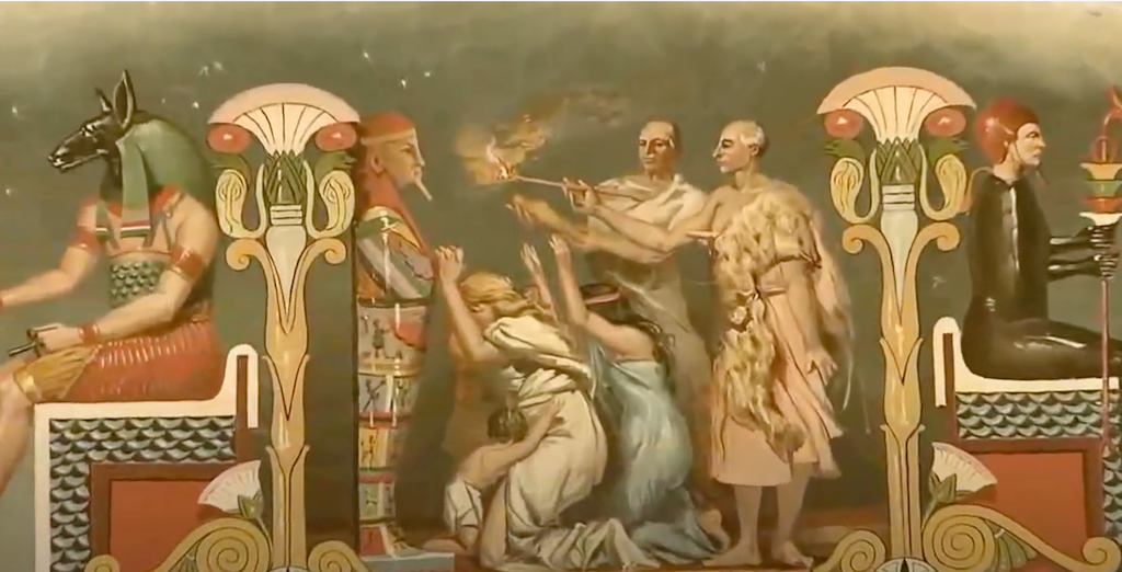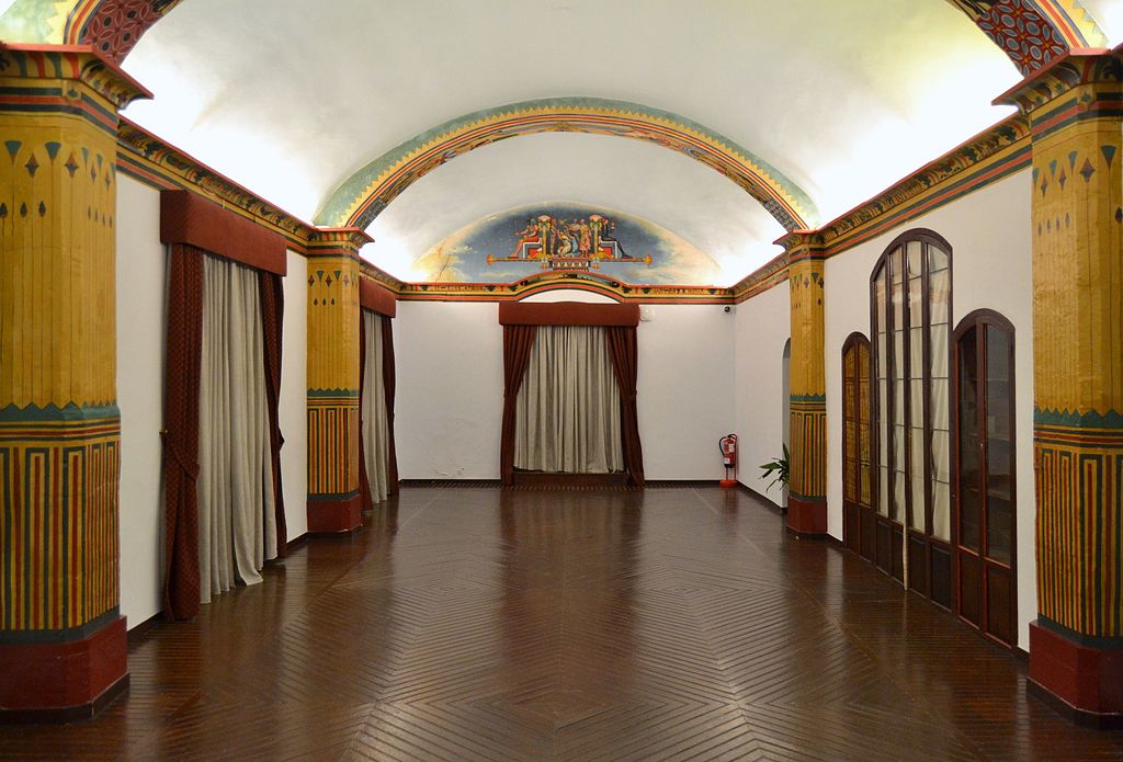La sala va ser decorada per l’erudit local Pere Ibarra amb motius egipcis sobre la vida i la mort. El redescobriment d’Egipte per Napoleó va alimentar l’imaginari europeu huitcentista d’una saviesa amb tints esotèrics de la qual en realitat poc o gens no se sabia. Al sòl de la sala, hi ha símbols maçònics, un dels quals està situat sobre una trapa, que facilitava la fugida dels congregats pel soterrani en cas de ser sorpresos en una de les reunions secretes.