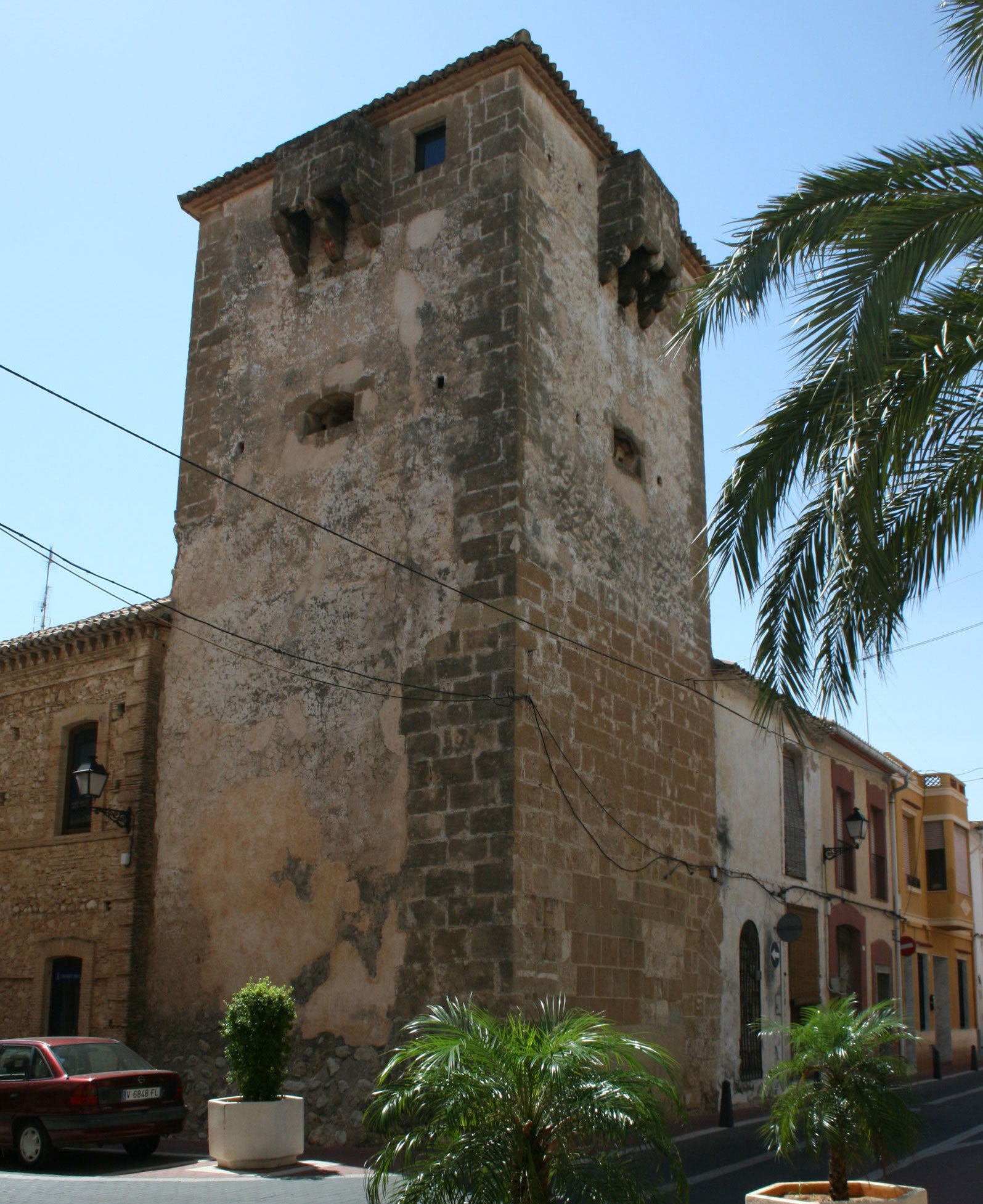 L’entrada original, que encara perdura, si bé tapat i emmascarat, està configurat per un arc de mig punt a l’exterior i amb volta rebaixada en l’interior, al qual s’accediria per mitjà d’un xicotet pont llevadís o per una escala de fusta fàcilment desmuntable.