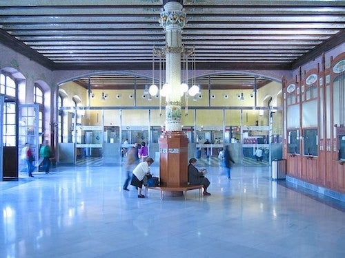 Presenta planta rectangular i dues zones clarament diferenciades: el gran hangar, de planta igualment rectangular i tancat amb estructura d’arcs articulats d’acer laminat, i l’edifici de viatgers pròpiament dit o vestíbul, de planta en U i pilars independents de l’estructura de l’hangar. Per bastir-lo, s’empraren nous materials introduïts a finals del segle XIX, com ara l’estructura metàl·lica en forma de marquesina. Un altre tret típic d’aquesta estació modernista és la integració de totes les arts en una mateixa edificació: arquitectura, escultura, pintura i arts decoratives.