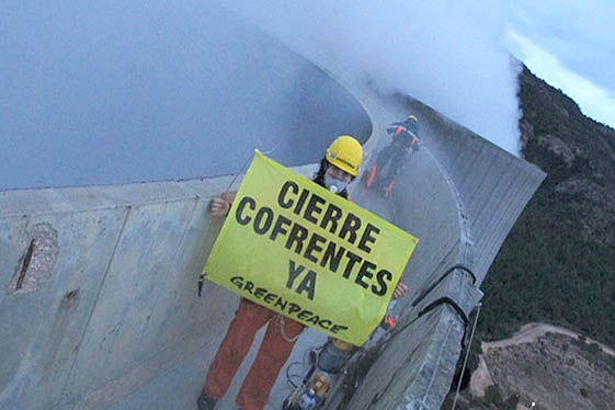 Doncs, de bona matinada, uns vint activistes penetraren a l’interior de la central nuclear, sis escaladors pujaren a una torre de refrigeració de 125 metres d’altura i pintaren el missatge: “PERILL NUCLEAR”; un altre grup desplegà una pancarta amb el lema “COFRENTS: TANCAMENT JA”. L’objectiu era protestar pacíficament i cridar l’atenció pública perquè el govern no allargara el permís de funcionament d’aquesta central que caducava aquell mateix any, després d’haver complit tot el període per al qual havia sigut dissenyada. L’acció va demostrar també el baix nivell de seguretat existent respecte a un possible atac terrorista.