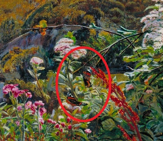 Strayed Sheep (1852); detall, amb Vanessa atalanta.