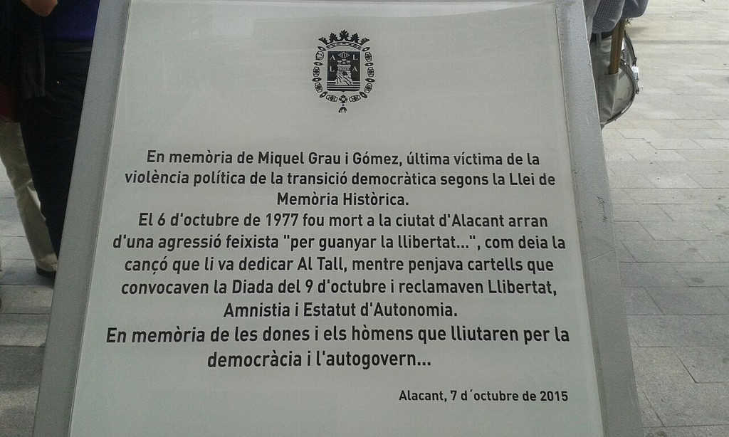Perquè després de dècades de governs aliens a aquest sentiment, ara, els governants d’Alacant es mostren oberts a commemorar la festa. I ho fan amb el reconeixement a Miquel Grau, jove assassinat pel feixisme al centre d’Alacant quan penjava cartells que precisament animaven a celebrar el 9 d’Octubre a la nostra ciutat, l’any 1977. Si els cartells hagueren reivindicat alguna altra cosa, hui Miquel seria entre nosaltres. Han hagut de passar 38 anys per dur a terme un homenatge oficial a la figura de Miquel Grau. Durant aquest llarg període de buidor, entitats cíviques com el Casal Popular Tio Cuc han estat les úniques en treballar per mantenir la memòria de Miquel. I la identitat valenciana d’Alacant. I el 9 d’Octubre. I el 25 d’Abril. I la llengua. I d’altres dates i fets significatius. Però ara ja no són només aquestes entitats les que treballen per la memòria i per la identitat. Ara, part del govern de la ciutat es suma per reforçar aquestes commemoracions. I aquesta suma ha donat una transcendència inèdita als actes. Per això, s’ha d’agrair la tasca d’entitats cíviques com el Casal Popular Tio Cuc, tants anys treballant des de l’anonimat, sense més suport que el dels seus socis, amb una motivació totalment desinteressada. I amb l’únic objectiu de mantenir viva la memòria. Miquel Grau serà homenatjat amb una placa a la Plaça dels Cavalls, on va ser assassinat.