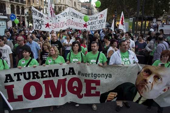 Ací en canvi, primer decretaren l’augment de la càrrega lectiva als professors i la massificació dels alumnes, i quan ja havien colpejat prou l’Ensenyament Públic llavors digueren que anaven a millorar-lo amb aquesta llei autoritària, partidista, retrògrada, neoliberal, catòlica, cínica, classista, sexista, recentralitzadora, que no ha tingut en compte els sectors implicats, que disminuïx la participació i l’autonomia de la comunitat educativa; una llei aprovada per un govern arcaïtzant, prepotent, aïllat, d’ordene i mane, que s’empenya en augmentar les hores de religió catòlica i fer-la puntuable, com en el franquisme (quan ens lliurarem d’aquests residus tòxics de la dictadura?); una llei que sols beneficia els centres privats i imposa proves per a establir rànquings i segregar l’alumnat massa prompte, fregant la il·legalitat, i mancada de la dotació necessària per a implantar TICs, NESE, desdoblaments, etc.