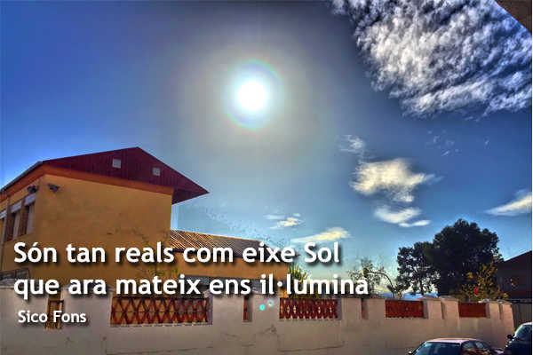 “Com si menjares peres i les cagares senceres?”, preguntava jo tot sorneguer. L’al·ludit, potser, mirava arreu cap a tots els costats i cap amunt com cercant alguna cosa que corroborara les seues paraules, i insistia: “Et dic que és veritat; existeixen, i ningú no pot negar això. Són tan reals com eixe Sol que ara mateix ens il·lumina”, sentenciava amb posat triomfant. Jo intentava esguardar el Sol amb els ulls mig closos i replicava assenyalant amb el dit: “Doncs no és per res, però està una mica núvol. Mira, mira… quin núvol hi ha que amenaça tapar l’altiu, orgullós però pobre i llunyà Sol”.