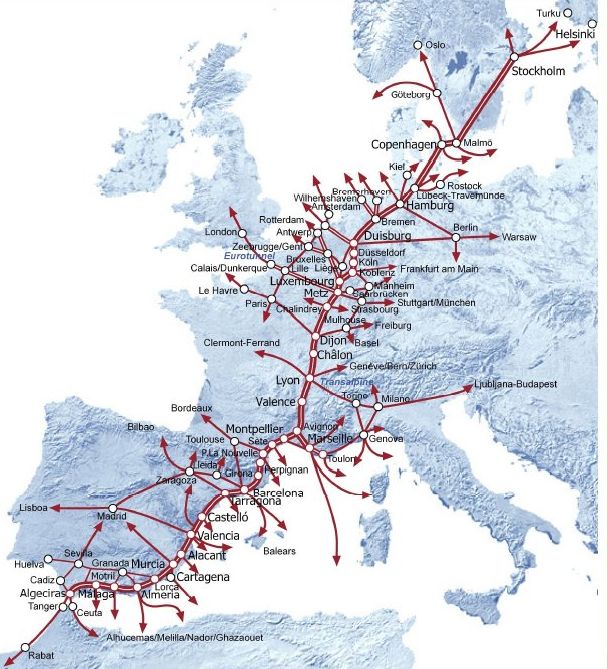 Esta línia de comunicació transportarà cada any fins a un total de 7,7 milions de persones, comunicarà 83 ports de tot Europa i 37 aeroports. Al mateix temps, es construirà una línia d’alta velocitat AVE de més de 15.000 km.