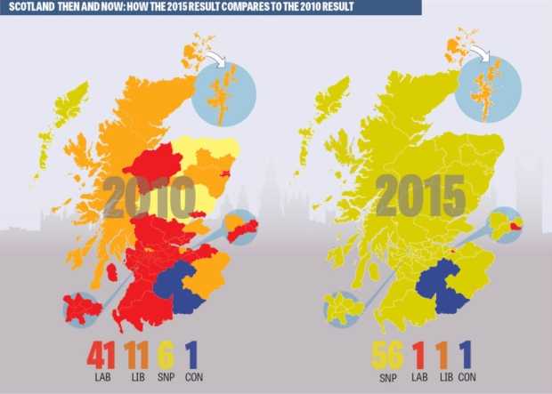 La campanya del referèndum per la independència ha tingut unes conseqüències terribles per als laboristes escocesos que han pagat molt car el seu suport al NO (amb totes les diferències es podria establir un paral·lelisme amb el PSC a Catalunya), han passat de 41 escons al 2010 a només 1, la seua alineació junt a conservadors i liberal-demòcrates en la campanya Better Together (Junts Millor) els ha provocat un desgast irreparable: els votants escocesos recorden totes les promeses que els van fer per tal de convéncer-los per a votar no a la independència, cap d’aquestes promeses s’ha materialitzat, s’han sentit enganyats i han aprés la lliçó.