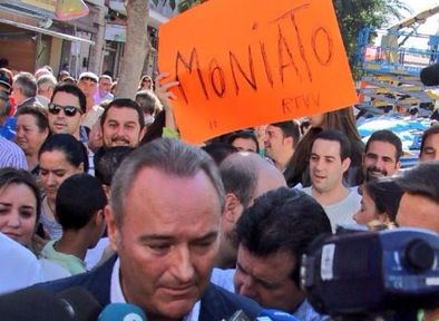 I va succeir que mentre Fabra responia a les preguntes d’algun periodista, repetint una volta més el mantra de què el seu partit és inflexible en la lluita contra la corrupció i bla, bla, bla, bla …, com si tots fórem imbècils i ens xuplarem el dit, algú de entre el públic va alçar sobtadament darrere d’ell una xicoteta pancarta en què es llegia només una paraula: Moniato. I una foto va immortalitzar aquest moment, que hi ha aparegut en nombrosos mitjans de comunicació escrits en el últims dies.