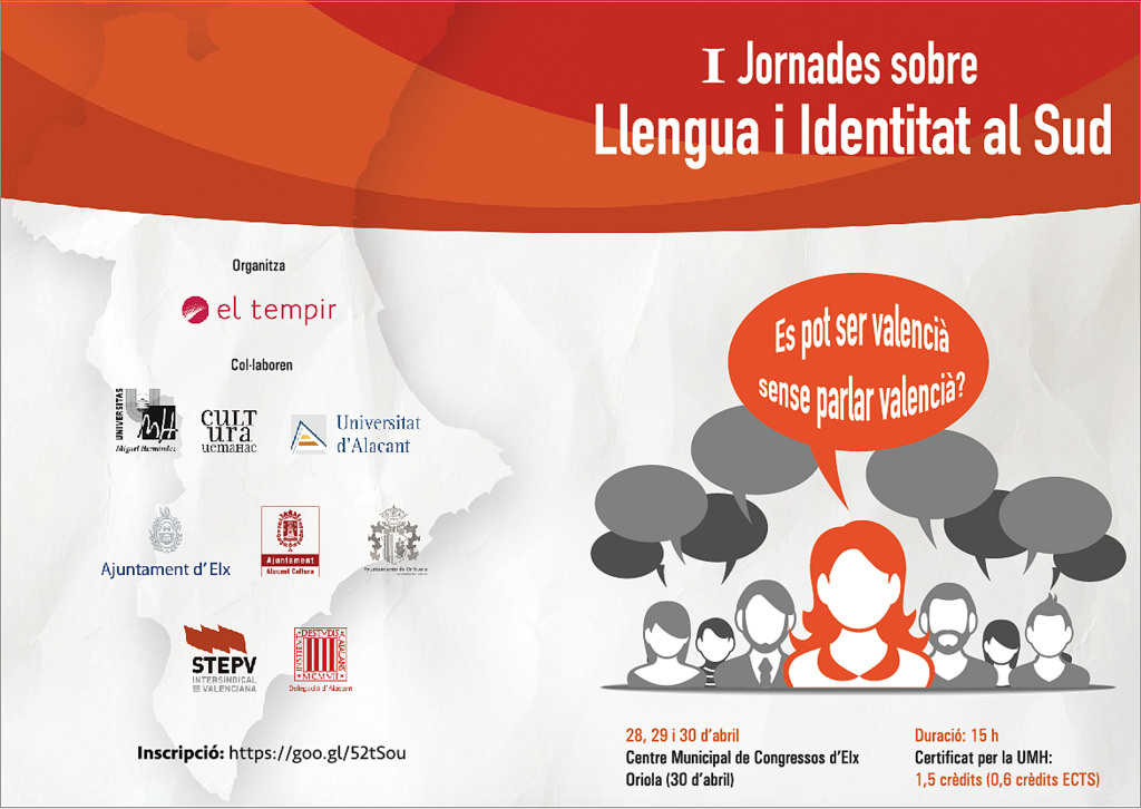 En definitiva, es tracta de construir una identitat valenciana sense renúncies ni fractures al sud. No ens ha de preocupar tant què fórem en el passat (no ho hem d’oblidar i hem de tenir-ho ben present) sinó què hem de construir junts, on volem anar i què volem ser. Hem de posar punt final a aquesta identitat fràgil que permeta convidar a un altre projecte modernitzador i valencià els qui se senten murcians, espanyols, russos, suecs, equatorians… Si ho vam aconseguir fa segles, per què no ho hem de poder aconseguir ara. Si en l’època medieval d’una amalgama de catalans, aragonesos, castellans, navarresos, occitans, etc., que poblaren les nostres terres, va sorgir una identitat valenciana amb una llengua comuna, per què no ho podem aconseguir ara: tots valencians i una llengua que faça de pal de paller independentment de la pròpia de la comarca o de la tria personal o d’origen. Siguem valents i agosarats. Siguem oberts, dialogants i inclusius. Arrisquem! Per això, us convidem a assistir a les nostres I Jornades sobre la Llengua i Identitat al Sud i a ajudar a respondre la pregunta que obri aquest text: es pot ser valencià sense parlar valencià?