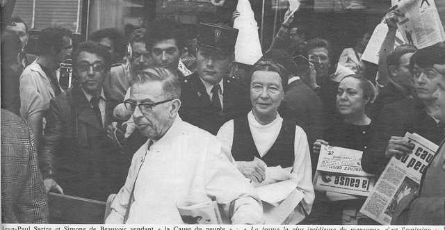 A la foto es pot observar a l’especial “parella” formada per Jean Paul Sartre i Simone de Beauvoir, acompanyats d’una colla d’intel·lectuals, venent un periòdic, destaca, just al darrera de Sartre, la figura del policia de torn, símbol del poder. La imatge correspon a un moment concret, just després del maig francès, quan el Govern francès de dretes d’aleshores va prohibir el periòdic esquerrà “La Cause du Peuble”, un setmanari enfrontat amb el sistema i, per tant, dolent.