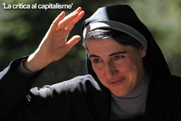 La intervenció de Teresa Forcades es va fonamentar en una crítica al sistema capitalista actual. El funcionament econòmic neoliberal només beneficia a un 1% de la població més rica i perjudica i sacrifica a la resta de la població, sobretot a les perifèries que en són víctimes. A partir del llibre d’Enrique Dussel, “Metàfores religioses de Marx”, Forcades i Dussel fan una lectura d’El Capital de Karl Marx de manera creativa i innovadora. Des de la crítica al ‘fetitxisme’ (un producte fet per les nostres pròpies mans que es torna objecte d’adoració i sacrifici); critica la idolatria dels sacerdots i dels profetes dels diners, els defensors del capitalisme, que s’agenollen davant el capital i generen tantes víctimes perquè es col·loquen aquest sistema en un pedestal i l’adoren, idolàtricament, sense tenir en compte les destrosses i els sofriments que ocasiona. Això passa perquè s’invisibilitza la destrucció social (els desnomanents, l’extrema pobresa, les morts, el terrorisme d’estat, etc.) i s’oculta sota les catifes dels mitjans de comunicació aquest sistema criminal i genocida basat en l’explotació, la cobdícia, l’acumulació d’uns pocs, les desigualtats extremes nord-sud, centre-perifèries, per la manca d’ètica i per la indignitat dels qui no tenen cap límit ni aturador ètic més que aconseguir els màxims guanys.