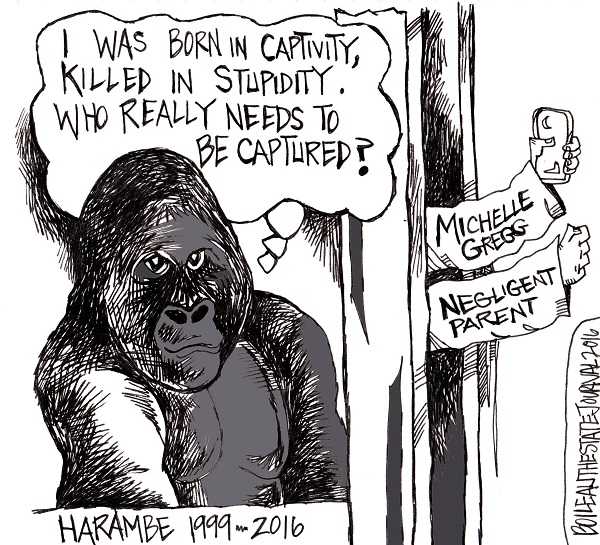 Una odiosa vinyeta ha posat el Harambe, encara viu, a dins d’una barca plena de persones que fugen de la fam i la guerra a través del Mediterrani. Només ell va a dins d’una gàbia, mostrant que seria l’únic que no ha pujat voluntàriament a l’embarcació, mentre que un home amb barba diu que el porten per veure si, així, a la gent li importa allò que li passe. Estic segur que és el dibuix d’un home occidental i acostumat a apropiar-se del que no és seu, com el Harambe i l’home amb barba, que ja en té prou amb la seua tragèdia per ficar-se a engabiar goril·les morts a trets.