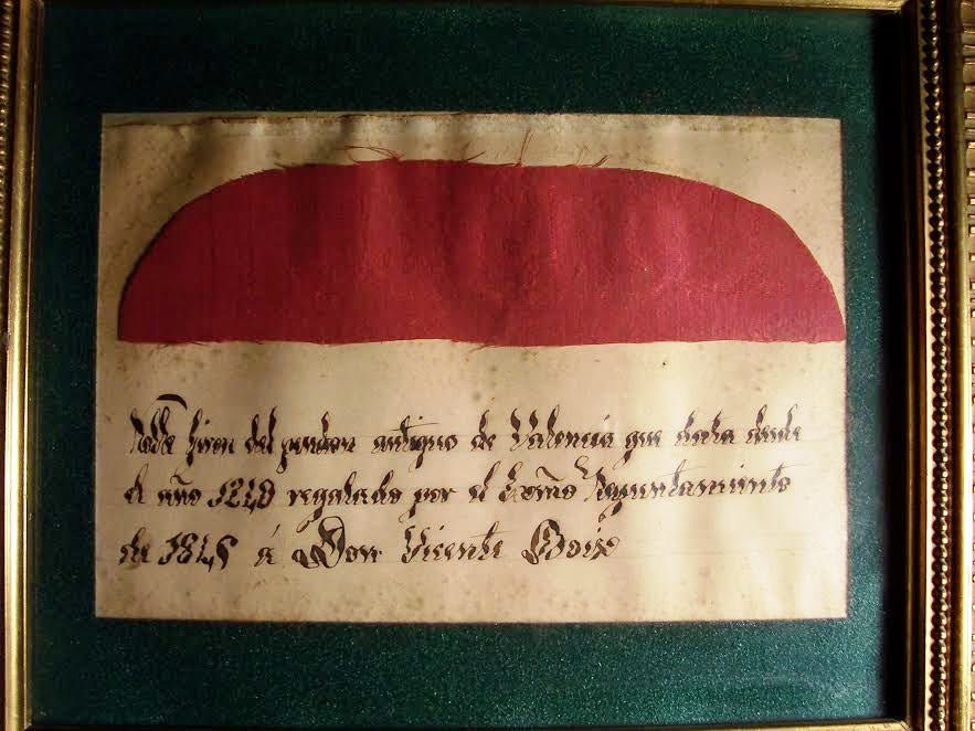I molt més clarament encara, disposem d’una prova d’aquesta modificació: Un trosset de la senyera tallada que li regalà el 1849 l’Ajuntament de València a l’historiador Vicent Boix, que era propietat particular del venerable valencià Pere Maria Orts i Bosch i que aquest va donar a l’Ajuntament de València. A davall del tros del tela, hi podem llegir: Noble girón del pendón antiguo de Valencia que data desde el año 1240 regalado por el Excmo. Ayuntamiento de Valencia de 1849 a D. Vicente Boix. Aquesta seria, doncs, a manca d’altres proves més concretes, la data (o si més no, una data molt propera) de la modificació de la primitiva senyera de la ciutat.