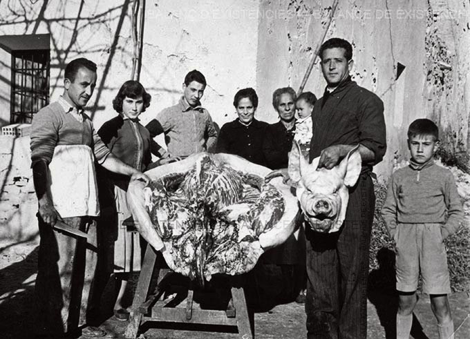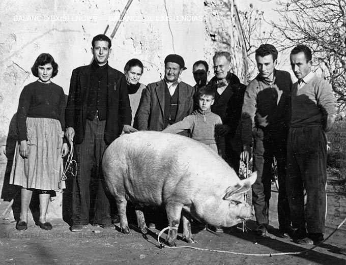 Aquest ha estat condemnat per aquesta família, que podia haver sigut la seua, a ser agarrat pel nas amb un ganxo i arrossegat fins al cadafal perquè se li done una ganivetada que no siga mortal, a fi que la seua sang fluïsca lentament fora del seu cos, fins a l’última gota, espentada colp a colp pel seu cor, fins que els seus batecs es detinguen i els seus inútils i desagradables grunys s’apaguen. L’han condemnat a ser escaldat, rapat, eviscerat i esquarterat. Com faran amb els seus descendents, com han fet amb milions dels seus avantpassats. Per a ell no hi ha un últim sopar. La fam que sent a través de la por, li ve perquè l’han deixat a posta en dejú, per tal que els seus intestins estiguen ben drenats. Amb ells, amb la seua sang, el seu greix, el seu estómac, la seua bufeta, la seua cansalada i la seua carn feta xixina faran sobrassades, xoriços, salsitxons, llonganisses i botifarres. Els que ara l’acompanyen i uns quants més es lleparan els dits amb les seues potes, amb les seues costelles, amb la seua cua, amb les seues orelles i amb el morro amb què ha fotjat en els pitjors albellons. I també amb les seues turmes (si és el cas), però aquestes ja se les van menjar el dia que el van capar. Es menjaran fregits els seus ronyons. Amb el seu fetge i amb els seus ossos faran sopa, i amb les seues cuixes pernils. Ja està disposada la ceba, el pebre negre, l’all, el julivert, la sal i el pebre roig que donaran sabor a les seues despulles. Els ganivets ja estan esmolats, les pasteres netes, l’aigua ja bull en les calderes, els llibrells esperen l’amassament de les seues restes.