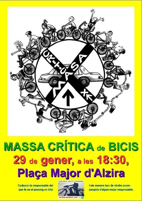 I nosaltres també farem la Massa Crítica ja que, pensem, és el moment adequat perquè eclosione la bicicleta. Cal animar-se i eixir al carrer amb ella per a gaudir, acostumar els veïns i reivindicar el canvi de model de transport i societat. És l’hora de la bici.