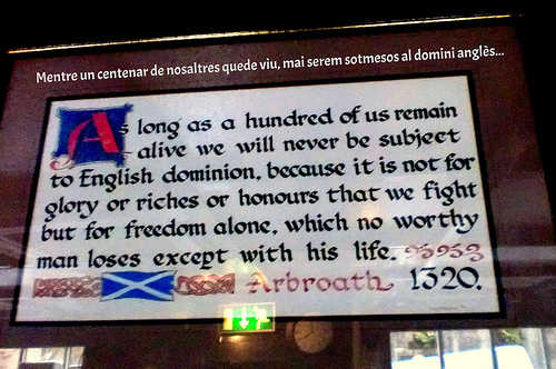 “Mentre un centenar de nosaltres quede viu, mai serem sotmesos al domini anglès, perquè no és per glòria ni riqueses pel que lluitem, sinó per la llibertat mateixa, per la qual cap home respectable no donaria sinó la vida” Arbroath 1320.