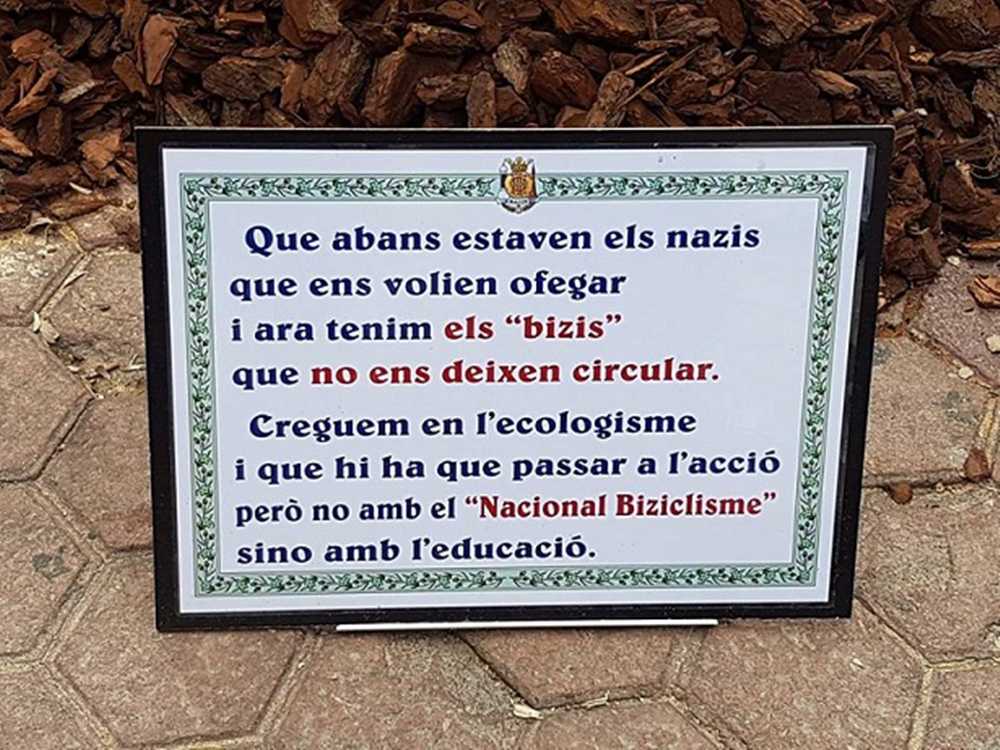Qui va escriure el cartell o no sap res d’història, cosa greu perquè parla sense saber, o vol trivialitzar els crims de nazis i franquistes, cosa encara pitjor a causa de la complicitat que implica (a Alemanya i França, per exemple, està penat per llei trivialitzar la càrrega criminal del nazisme). El cartell fou molt desafortunat i ofensiu perquè òbviament els cicloecologistes no tenim res a veure amb aquells assassins –que la història se’ls trague per sempre– ni impedim circular ningú. De fet, en tota la legislatura, l’Ajuntament d’Alzira sols s’ha atrevit a tancar al trànsit un trosset del carrer Hort dels Frares (150 m) perquè era massa estret i feia anys que ho venien demanant els veïns. Així que els fallers de la Plaça Major s’han passat, molt.
