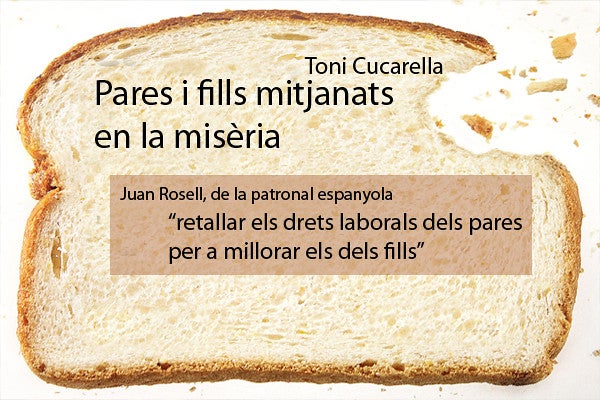 El president de la patronal espanyola, l’empresari nascut a Catalunya Juan Rosell, ha tingut una altra pensamentada d’aquelles que tomben un campanar, segurament just després d’haver-se candongat a dos queixos un sopar de repica’m el colze, d’aquells que costen el salari precari d’una vintena de treballadors, afiliació a la Seguretat Social inclosa i les pagues prorratejades. La pensamentada, o el rot, que s’ha espolsat el sacre de collons demana retallar els drets laborals dels pares per a millorar els dels fills [sic]. Caga’t ja, Martorell! És a dir, que ni drets per a uns ni drets per als altres: misèria per a tota la família. I les pensions dels avis congelada i entrant-se’n cada any que passa com el magre en l’estiu. Misèria per a tota la família del nostre braç treballador, és clar. No per a la d’ells. Demana Rosell que hi haja un contracte únic amb una indemnització encara més minsa que l’actual, com diu ell, tot “campechano”, un contracte «para todo el mundo, pero que cuando tengas que despedir puedas despedir». O siga, la coneguda llei del “puntelló al cul”.