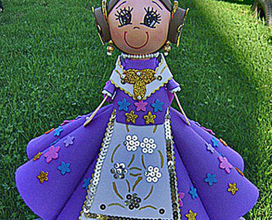Tanca els ulls i es veu amb aquest vestit en tons morat, violeta, la mantellina en lila i joies d’ametista, en fallera feminista davant la imatge de la Verge, a pas solemne i amb la figura alçada. Entre els llavis solament una pregària per clamar justícia, justícia divina per a aquest poble condemnat a la mesquinesa. Suplica a la mare dels desemparats que el Partit Popular no puga governar, encara que mane un tripartit de la Santíssima Trinitat.